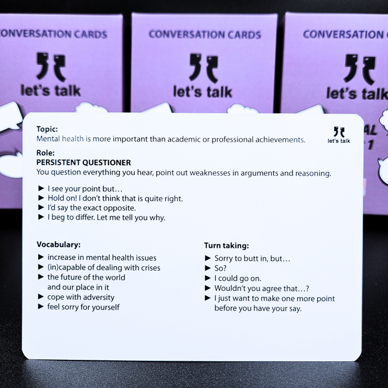 Let’s talk 4 real to podwójny zestaw pozwalający na przygotowanie uczniów do dyskusji na wiele tematów, pomagając im w doborze słownictwa oraz podsuwając im cały szereg wyrażeń i zwrotów, które umożliwiają włączanie się do rozmowy, przepraszanie za przerywanie komuś czy oddawanie głosu innej osobie.