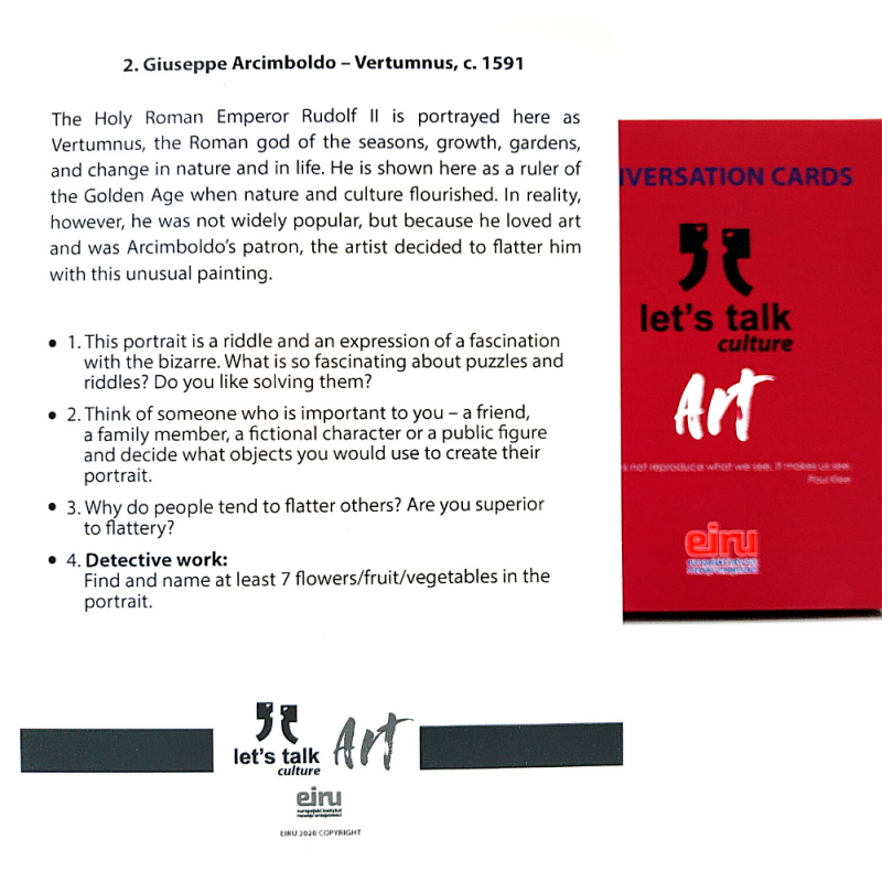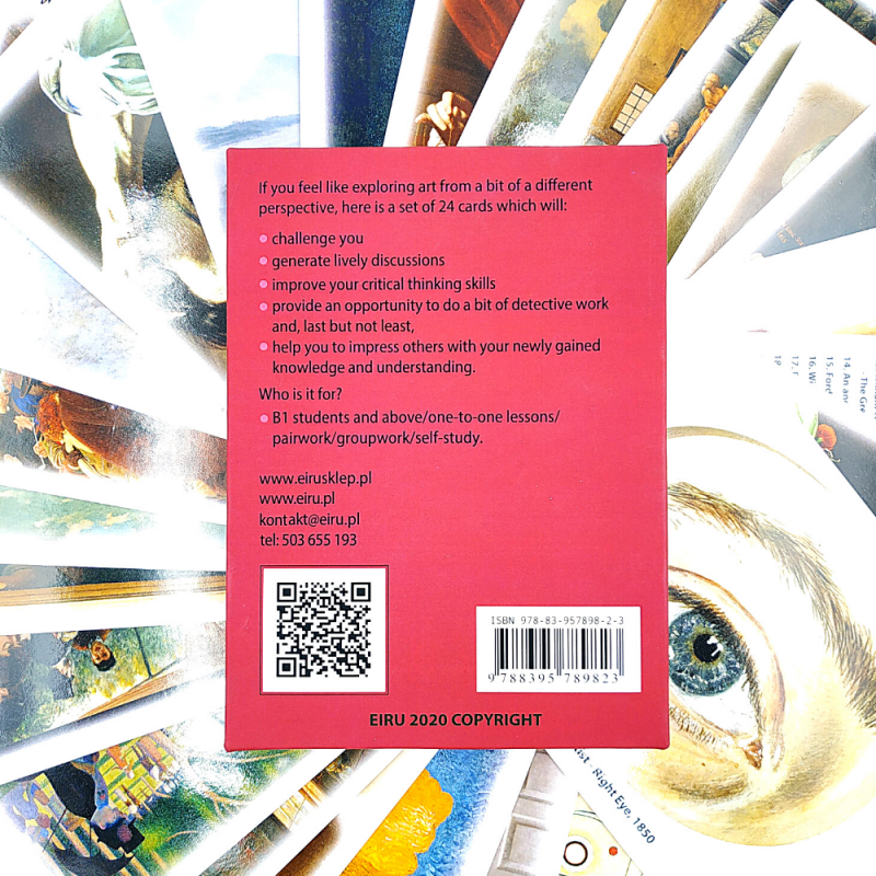 - Zarówno opisy obrazów jak i pytania zawarte na kartach stanowią bogaty zbiór słownictwa związanego ze sztuką i kulturą, który sprawi, że Twoi uczniowie poczują się pewniej w konwersacji!