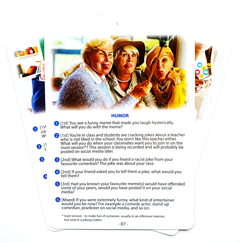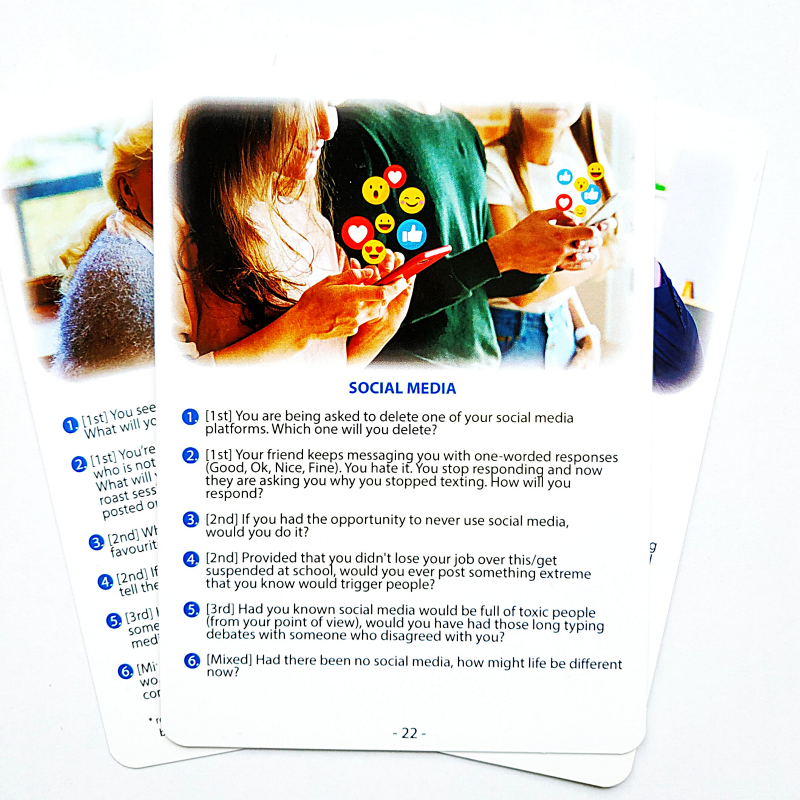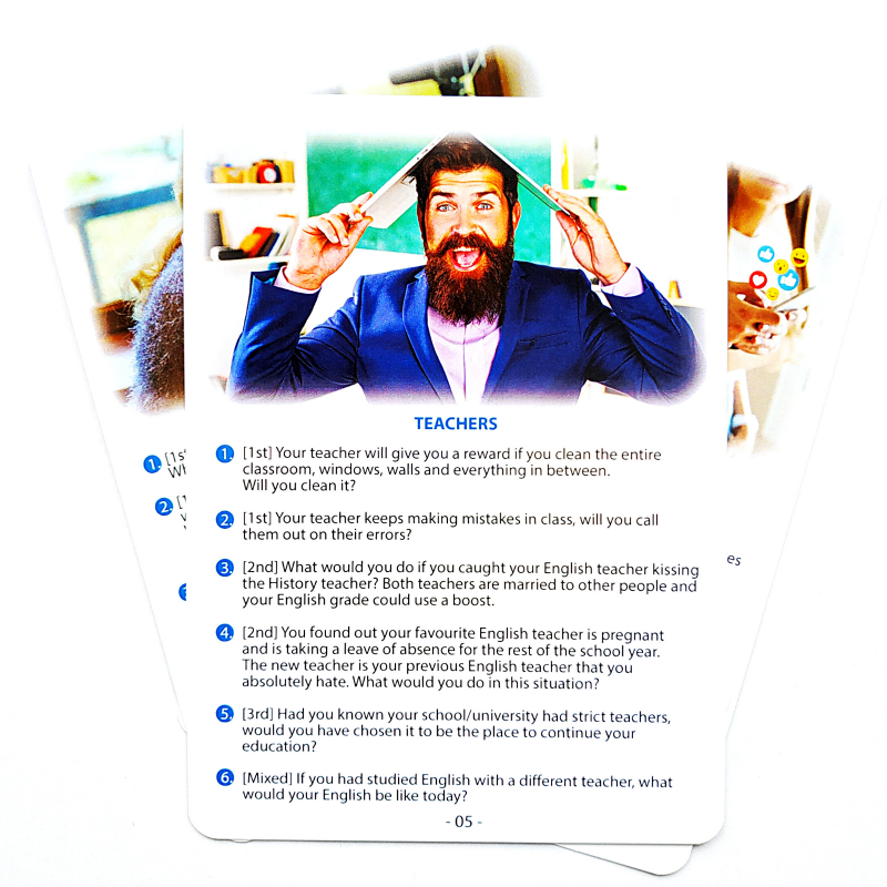 - Każda karta dotyczy innego tematu (relaxing, money, taking one for the team, teachers, dealing with the boss, date night, language learning, family drama, revenge, survival i inne)